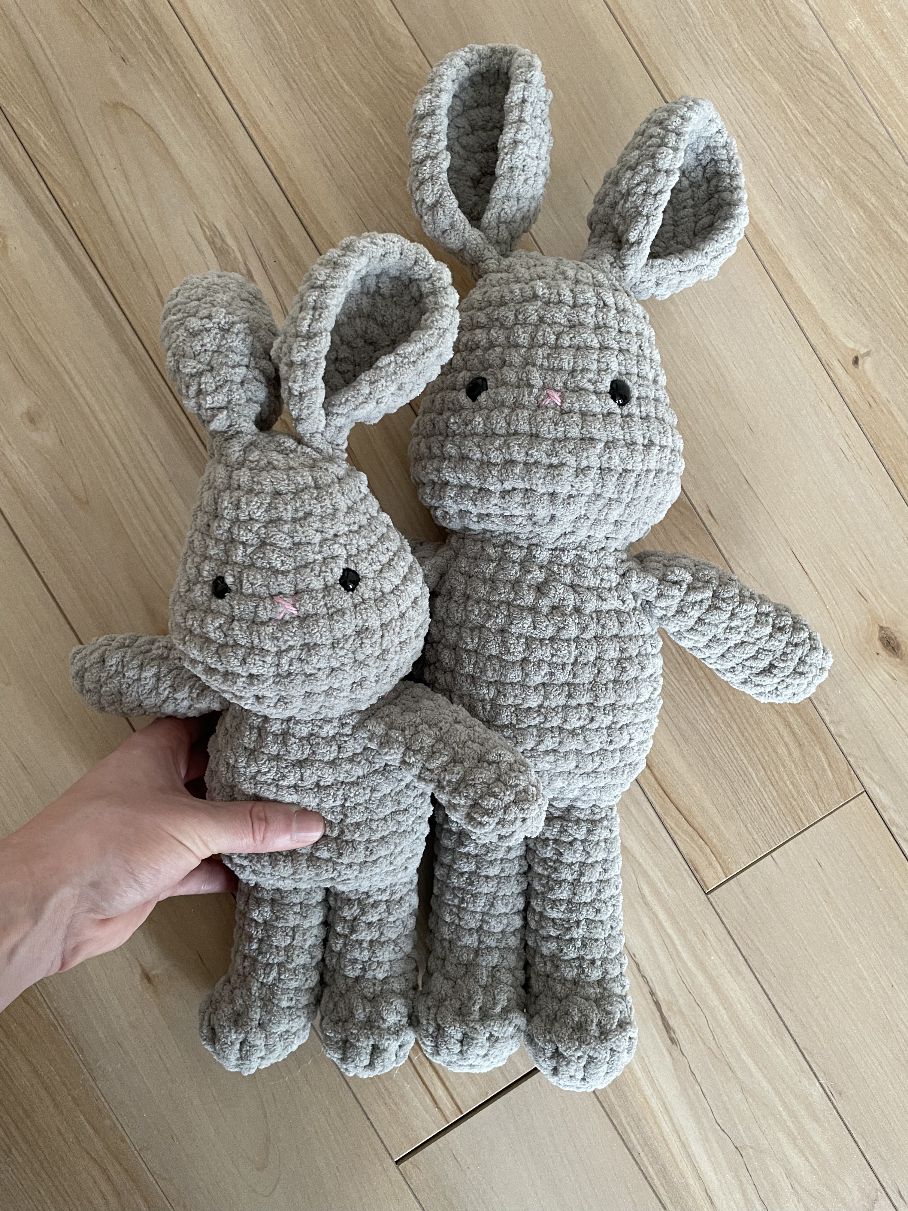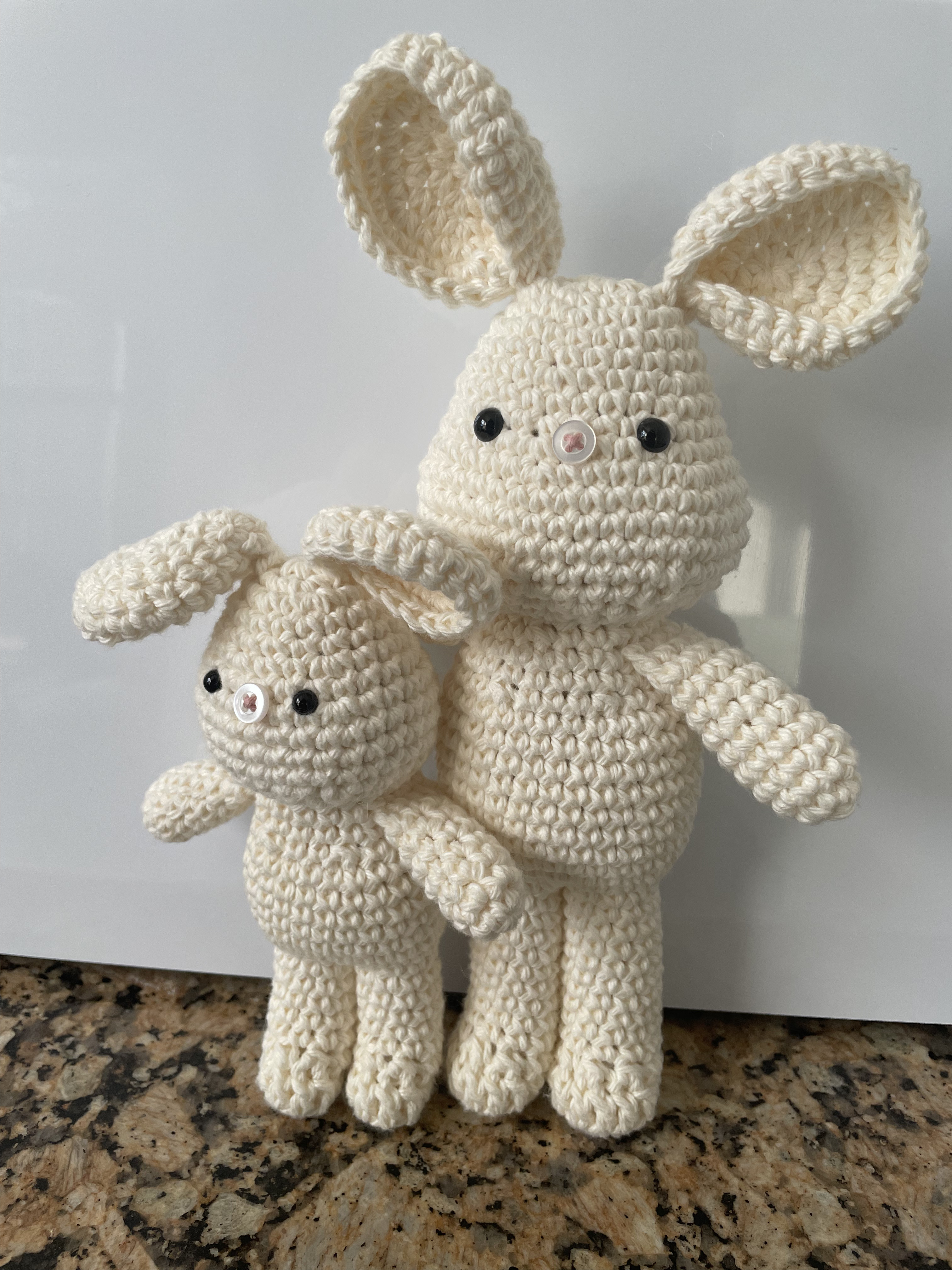 These bunny designs have been years in the making! I first crocheted the Mama & Baby Bunny in the autumn of 2022 using worsted weight yarn (Impeccable by Loops & Threads). They were originally crocheted in separate pieces and sewn together. I made Mama Bunny first. I remember it being quite a challenge to size the Baby Bunny down so the proportions were similar and just as cute.